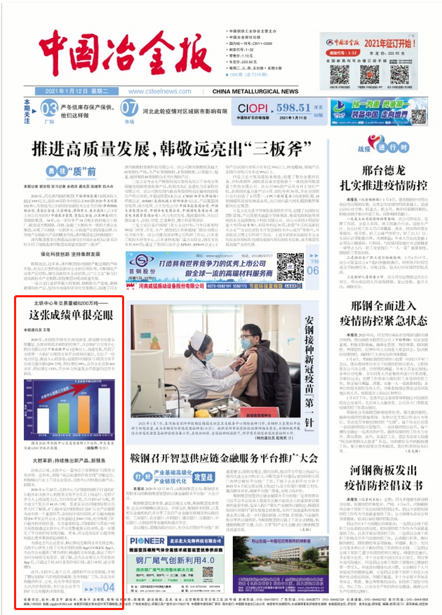 编者按:1月12日,《中国冶金报》头版以《北铁中心年交易量破6200万吨——这张成绩单很亮眼》为题,重点报道了我公司围绕 “商品流通和价格发现”功能定位,积极响应行业上下游企业需求,凭借优质高效服务赢得了行业企业的高度认可,年成交量连跨三个台阶的突出成绩。现将报道全文转载如下:
