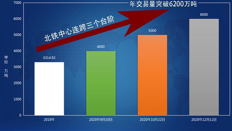 2020年,在国际形势发生深刻演变、新冠肺炎疫情全球蔓延、全球市场需求疲软的形势下,北京铁矿石交易中心股份有限公司(以下简称北铁中心)迎难而上,加速发展,巩固了全球第一大铁矿石现货交易平台的领先地位,交出了一份亮点纷呈、振奋人心的答卷:运营的中国铁矿石现货交易平台成交量突破6200万吨、同比增长89%,会员企业达到460余家、同比增长115%,平台年交易量及会员数量均达历史新高。